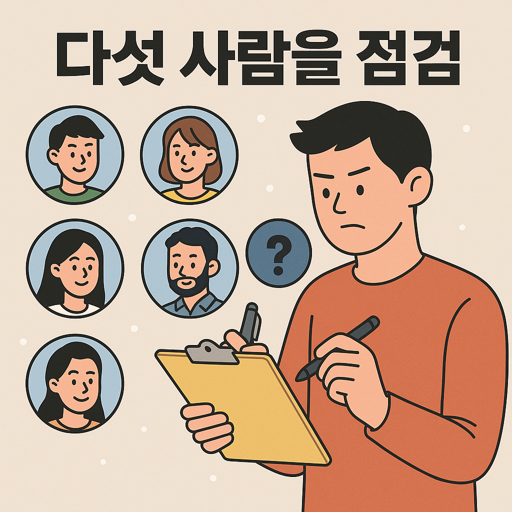 그렇다면 나와 가장 많은 시간을 보내는 다섯 명은 누구일까요? 친구일 수도 있고, 직장 동료일 수도 있으며, 심지어 유튜브나 책에서 자주 보는 인물일 수도 있습니다. 요즘은 직접 만나지 않아도 온라인에서 어떤 사람의 생각과 가치를 꾸준히 접한다면, 그 역시 내 삶에 영향을 줍니다. 만약 다섯 명 중에 부정적인 사람이 많다면, 내 삶에도 그런 기운이 퍼질 수밖에 없습니다. 반대로 노력하고, 배우고, 서로 응원해 주는 사람들이 곁에 있다면, 나는 매일 조금씩 더 나아질 수 있습니다.